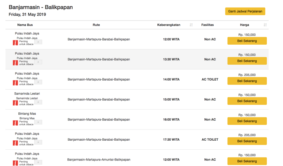 Terdapat pilihan jadwal keberangkatan bus yang tersedia beserta harganya , silahkan pilih dan klik tombol Beli Sekarang