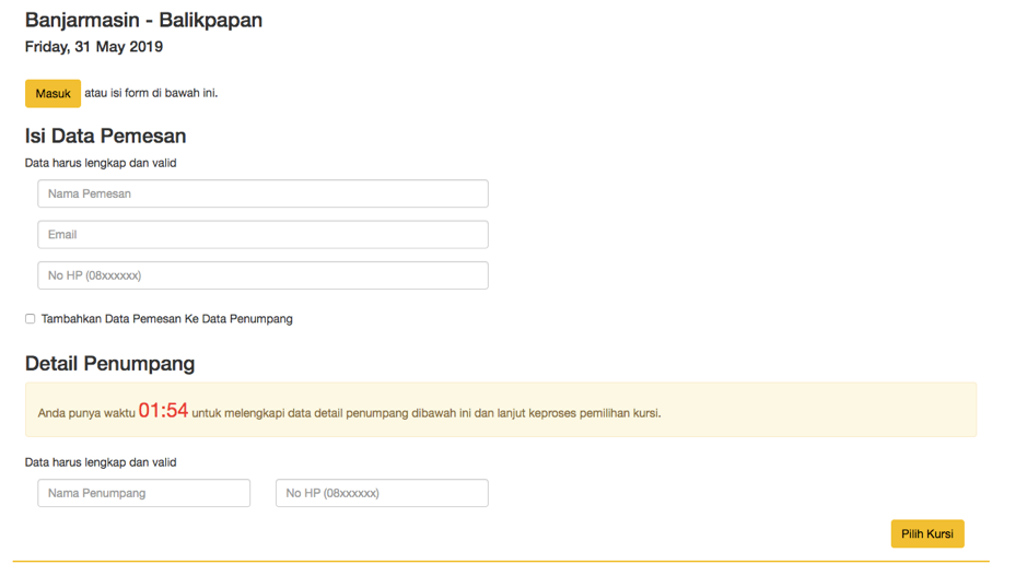 Masukan data pemesan dan data penumpang lainya, jika anda memesan satu tiket silahkan isi data pemesan selanjutnya centang "Tambahkan Data Pemesan Ke Data Penumpang". Klik tombol Pilih Kursi untuk melanjutkan