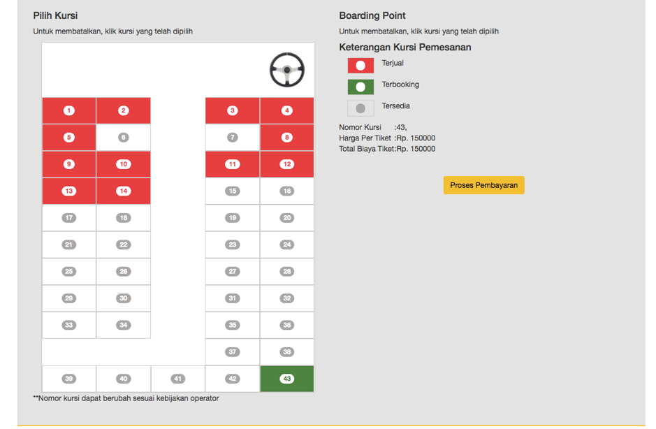 Silahkan pilih kursi yang masih kosong, klik Proses Pembayaran