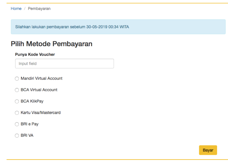 Pilih metode pembayaran yang anda inginkan, setelah itu klik Bayar, ikuti langkah berikutnya sesuai pilihan pembayaran yang anda pilih